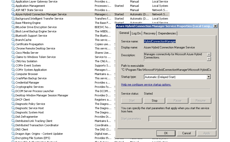 Setting up the Azure Hybrid Connection is a matter of following the documentation. It’s very simple, once everything is setup in the Azure Portal, you can download the hybrid connection client and install it with the ClickOnce installer. It installs the Azure Hybrid Connection Manager Service on your machine, which is responsible to talking to the Biztalk “Relay Agent” (Relay Agent is not the official term, I actually don’t know if they named the component anything) in Azure and that way establish a connecting between the cloud and your onpremise machine, without opening the firewall to access from the outside.