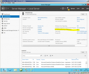 I just installed the preview of the new Windows Server 2012, and as with all server versions of Windows it comes with some annoying security features (at least if you are a developer). The first thing to disable was the Internet Explorer Enhanced Security Configuration. It has been moved a little bit since Windows 2008, but it is still in the manage server window, this timer under the Local Server.