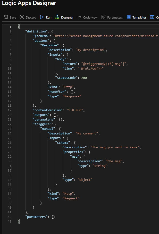 One problem I discovered when using the standard import functionality to get the Logic Apps into API management, is that the documentation in the API Management developer platform is really bad. The Logic App http trigger you can define the schema for if you use the code editor in logic app, you can then put description for the properties that becomes documentation in the API management developer portal. Here’s an example