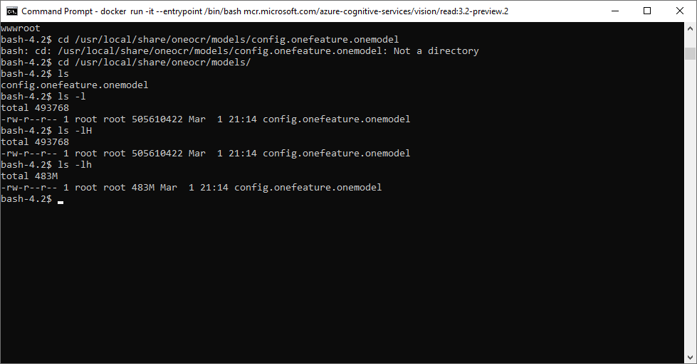 docker run -it --entrypoint /bin/bash mcr.microsoft.com/azure-cognitive-services/vision/read:3.2-preview.2