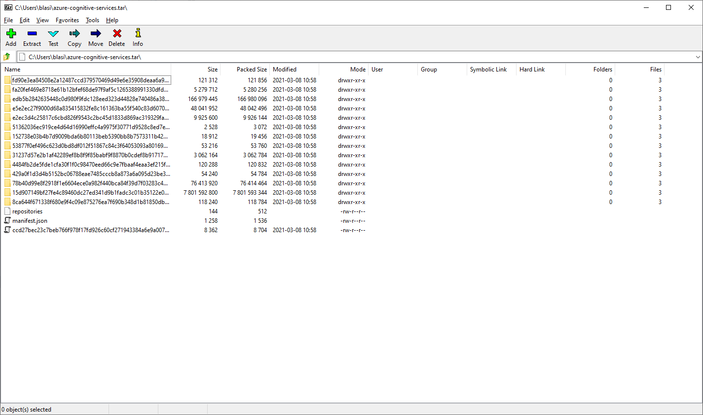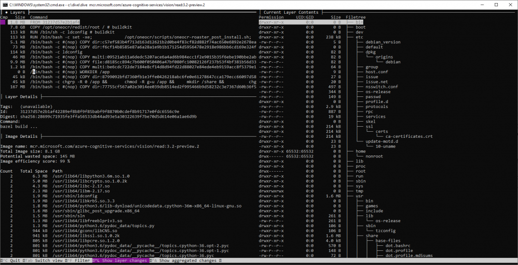 Another great way to explorer the contents of an docker image is using the open source tool dive. Dive allows you to browse the content, with the purpose of optimize image sizes by detecting large or unnecessary files. But it is good as an investigation tool. It is a bit slow at starting for large images the azure cognetive image is 8 GB, so on my machine it takes a couple of minutes before dive is ready.