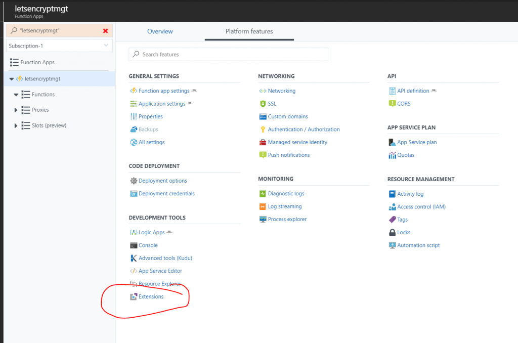 Then I created a resource group that I called Lets-Encrypt-Management, within this resource group I deployed a Azure Function App on the Dynamic Plan. Onto that Function App I installed the Lets Encrypt Site Extension without the Web