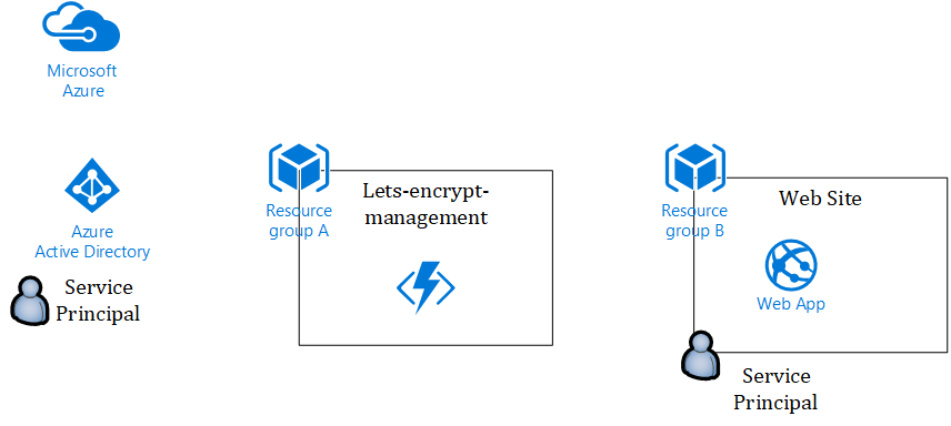 Finally in the last resource group I have Web Site with custom domain name attached, which I want to request a Let’s Encrypt certificate for. My service principal has been granted contribute permission to this resource group. In practice I could have any number of web sites, all being managed by separate functions inside a single function app.