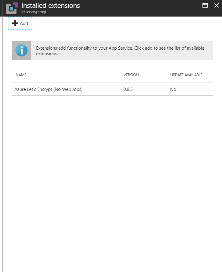 Then search for lets encrypt and pick the extension named “Azure Let’s Encrypt (No Web Jobs)”, once installed it should look like this: