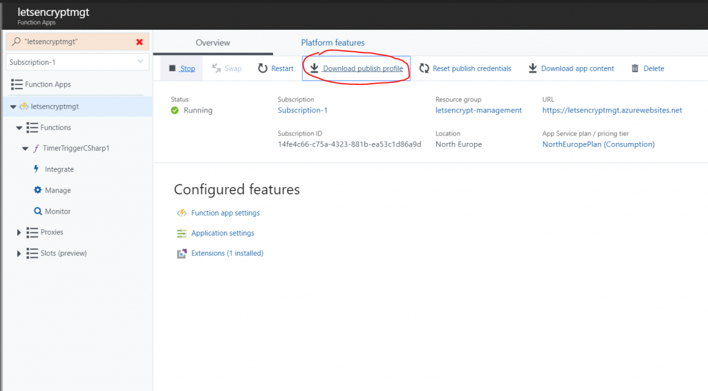 As the site extension is hosted in the Kudu Portal, we can use the publishing credentials for the function app to authenticate our call. You can download the publishing credentials from the portal and open the file in e.g. notepad.