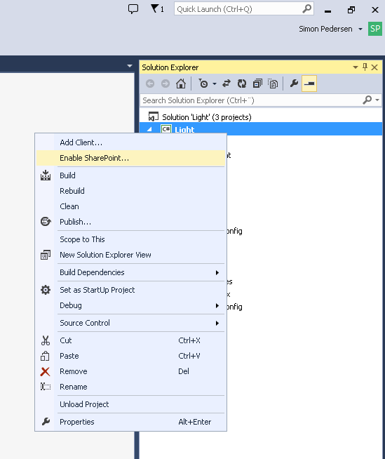 That will bring up a dialog where you can enter your SharePoint url, and in case it is a SharePoint online instance it will also ask for authentication. After that have been done you will be able to add SharePoint lists as data sources. The location of “Enable SharePoint” have changed from the preview version of LightSwitch where it was under properties, which did help to confuse me when I was watching the old tutorial videos from Beth, which is why I decided to post this to hopefully help other in the same situation as me.