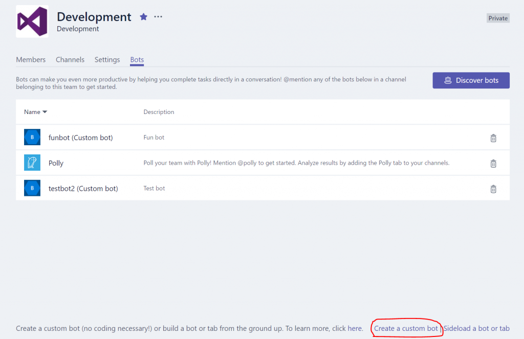 The one new feature that caught my attention was custom bots, bots for teams is not new, but until now you have only been able to talk to the bot in a 1:1 dialog. But with custom bots you can have a bot that is part of a teams channel, much like it is known from slack where that type of bots are very popular.