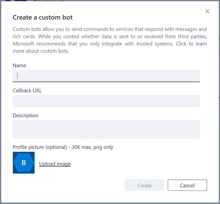 When you chose to add a custom bot, you provide a botname (which will also be the handle you use to communicate with the bot). A callback url (https) which is where teams should send the message when you talk to the bot, and you must reply in less than 5 sec. A description and an image.