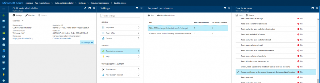 Once you have the application registered, you need to get an access token for the user once they click you “Install Addin” button. Getting the access token for the EWS API is not any different from getting an Access token for any other service that is integrated with Azure AD.