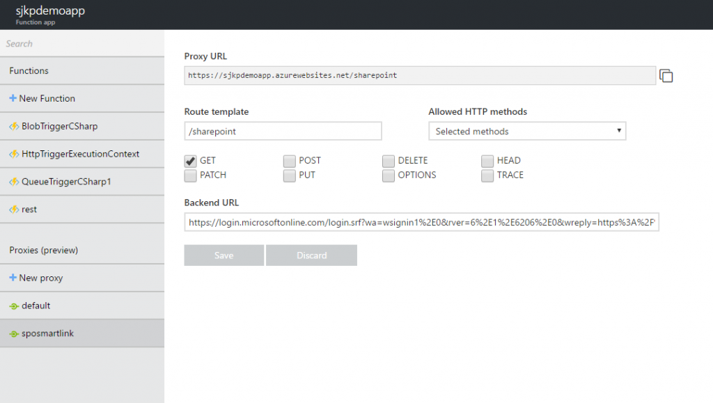 When the proxy is setup with a route like above, the root url of the Azure Function app will do a redirect to the smart link url. Obviously you can also set "route": "/sharepoint" to have the smart link have a different url. The proxies.json files also supports creating many proxies in the same file if you feel like it.