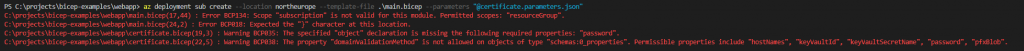 The only thing I didn’t manage to solve in my templates was how to return an array of output parameters. As you might have noticed I have two ugly output parameters from my certificate.bicep file, but I just couldn’t get it to validate my template if I returned the collection object that should be the result of the loop, I might be missing something or it might be a thing that needs to get fixed. If you have a hint let me know!