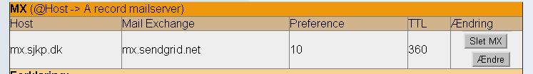 To create the hostname you need a domain name where you are able to configure a MX record to point to sendgrids servers. For my test purpose I created a subdomain mx.sjkp.dk, and configured the MX record the following way.