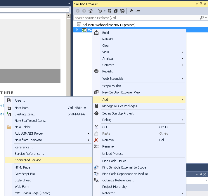 Once you have the Office 365 API Tools installed, a new menu “Connected Services” will appear under Add when you right click your project.