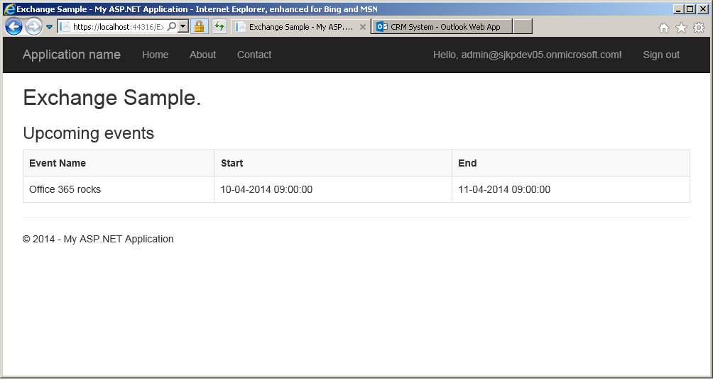 If you click on this, you will see an new dialog where you have to sign-in again. When you do that, you will be able to select which services you want you app to be able to use. In my case I simply selected Exchange and took both calendard permissions, and selected “My tenant only”. The Office 365 API Tools will now generate a ExchangeSample controller+views for you. When running the app you get the following overview of your apointments when browsing “/ExchangeSample/Calendar”