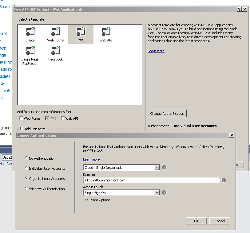 First you need to create a new ASP.NET Web Application – MVC project where you configure the project to use authentication, specifically “Organizational Accounts”. When you select your domain it is important that you use the same domain as your Office 365 subscription was created under (in my case sjkpdev05.onmicrosoft.com), as it will ensure easy connectivity between the app and the Office 365 API.