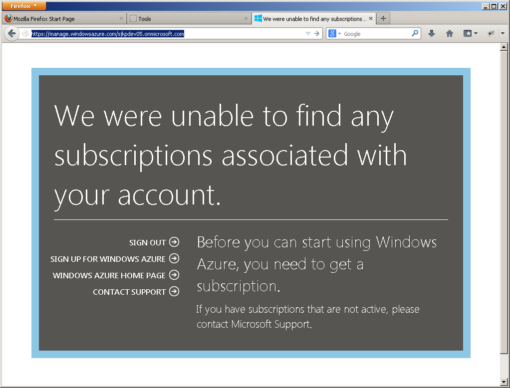 - From here you will be redirect to this ugly screen, telling you that you have no subscription associated with your account.