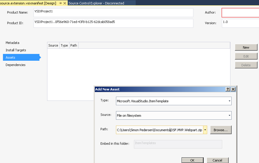 - The easiest way to create the VSIX package is to create a new visual studio project from the VSIX project template. In the vsixmanifest designer you can easily add your item template in the Assets dialog and point to your zip file.