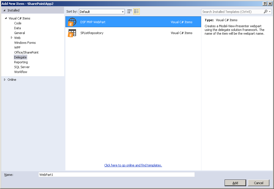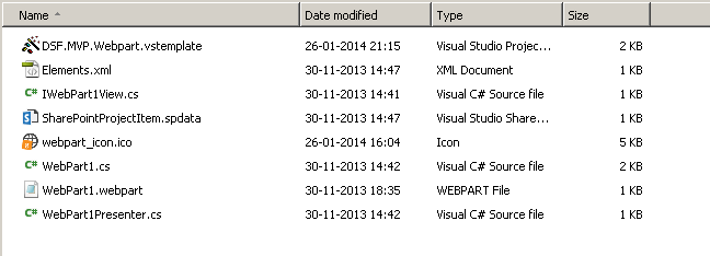 In my dayjob as a SharePoint Consultant, we use a framework created by some of my collegeaues when we create our SharePoint solutions. This is to help ensure that our solutions use the same coding patterns to improve maintainability, and to ensure as much code reuse as possible between projects. Our framework uses the Model-View-Presenter pattern for e.g. webparts, webcontrols and usercontrols, and we use Unity as our dependency container framework. One downside of our framework is that it requires creating a few extra files compared to a standard webpart created with Visual Studio’s built-in item template for SharePoint webparts. When you create many webparts it gets kinda tidious having to create these boilerplates files for our framework to work, that is why I was set out to create our own webpart item template for Visual Studio.