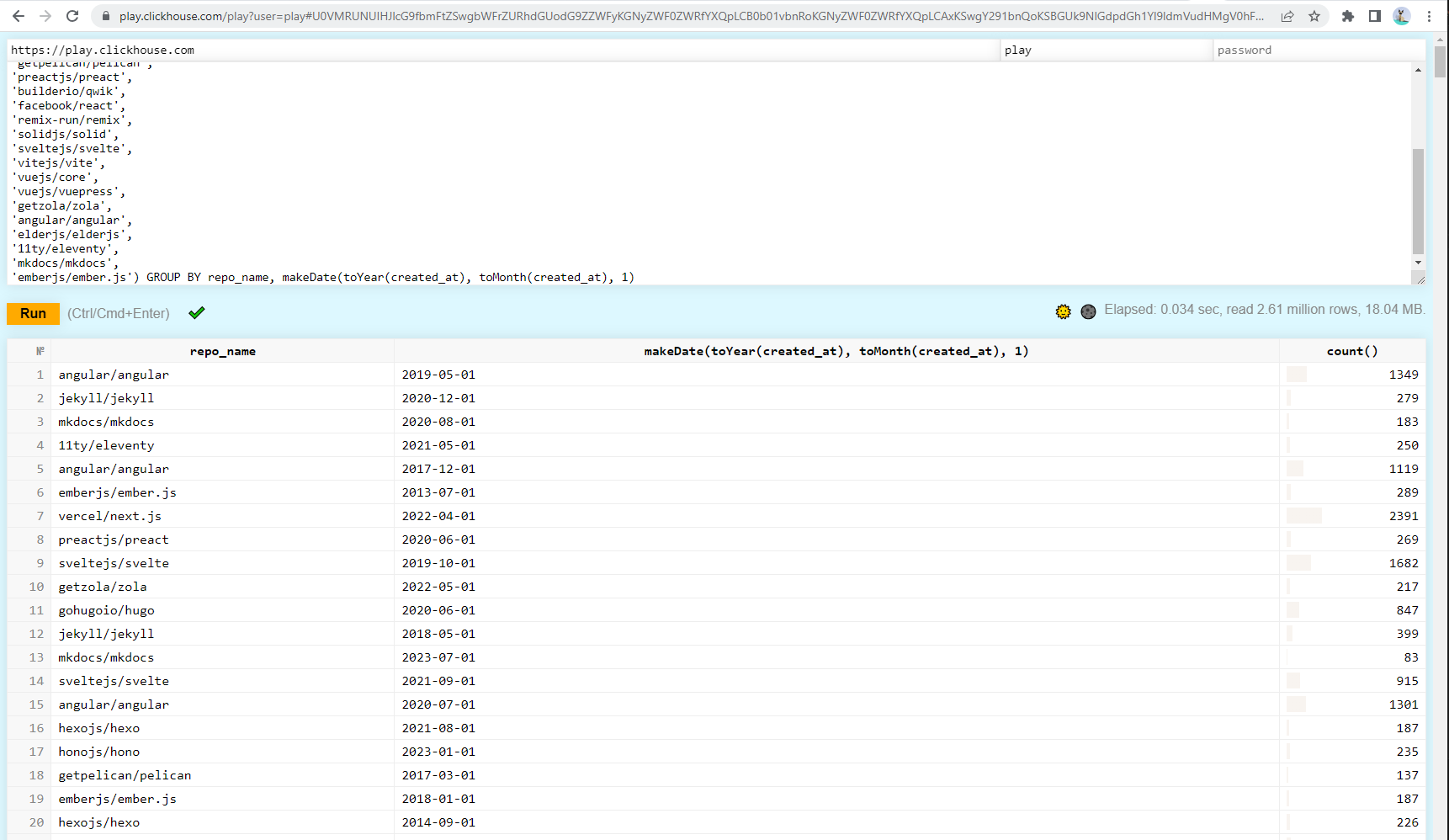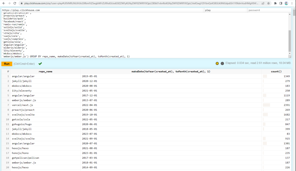 Crunching the raw data from GitHub, would make this task a little more time consuming than desired, so instead I decided to use Clickhouse’s data playground as they have already imported all the data, and Clickhouse is a perfect tool for querying large data set like these.