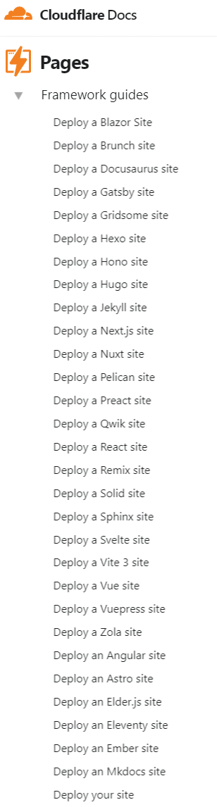 So next step is picking a framework, to do that I went to the Cloudflare Pages documentation and looked at which frameworks they have support for, and to my surprise the list is very long: