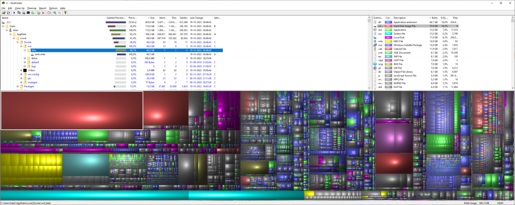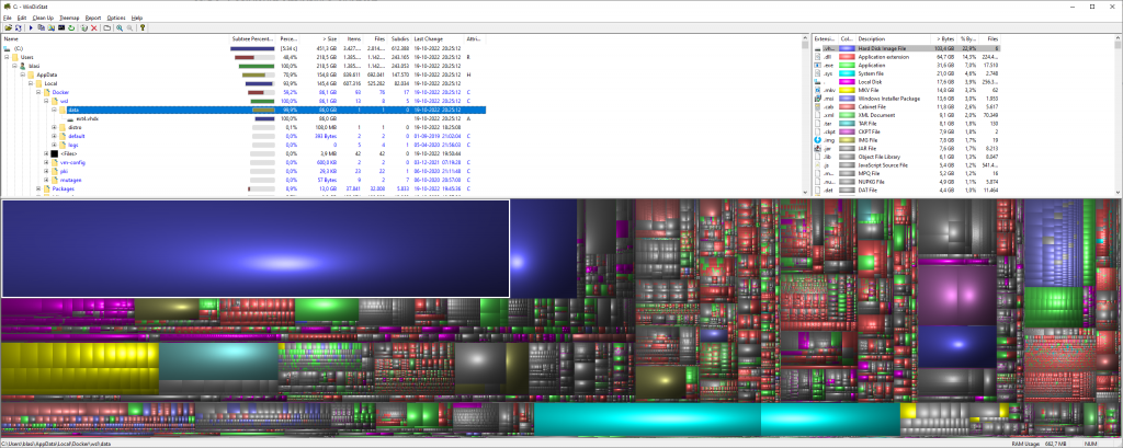 After a quick inspection with WinDirStat, it was clear that all my space was taken up by ext4.vhdx